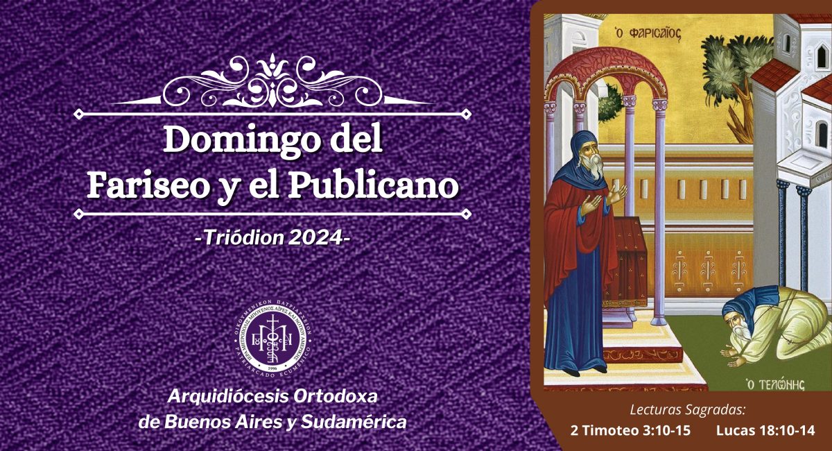 Los fariseos eran una secta antigua y destacada entre los judíos, conocida por su diligente observancia de los asuntos exteriores de la Ley. Aunque, según la palabra de nuestro Señor, «hacían todas sus obras para ser vistos por los hombres» (Mt 23:5), y eran hipócritas (Mt 23:13, 14, 15, etc.), por la aparente santidad de sus vidas, todos los consideraban justos y separados de los demás, que es lo que significa el nombre fariseo. Por otra parte, los publicanos, recaudadores de los impuestos, cometían muchas injusticias y extorsiones por causa de ganancias deshonestas, y todos los consideraban pecadores e injustos. Por lo tanto, según la opinión común, el Señor en Su parábola representó a una persona virtuosa por medio de un fariseo y a un pecador por medio de un publicano, para enseñar a sus discípulos el daño del orgullo y el beneficio de la humildad. Dado que el arma principal de la virtud es la humildad, y el mayor obstáculo para ella es el orgullo, los Santos Padres han fijado estas tres semanas antes de la Gran Cuaresma como preparación para las luchas espirituales de la virtud. Esta semana la han llamado Heraldo, ya que declara que se acerca la Gran Cuaresma; y pusieron la humildad como fundamento de todas nuestras labores espirituales al designar que la parábola del fariseo y el publicano se lea hoy, incluso antes de que comience el ayuno, para enseñar que, a través del orgullo del fariseo, el apestoso aroma de la soberbia y el hedor del orgullo ahuyentan la Gracia del Espíritu, despojan al hombre de toda su virtud y lo arrojan a los abismos del Hades; y, mediante el arrepentimiento y la oración contrita del publicano, esa humildad confiere al pecador el perdón de todas sus malas acciones y lo eleva a las mayores alturas.