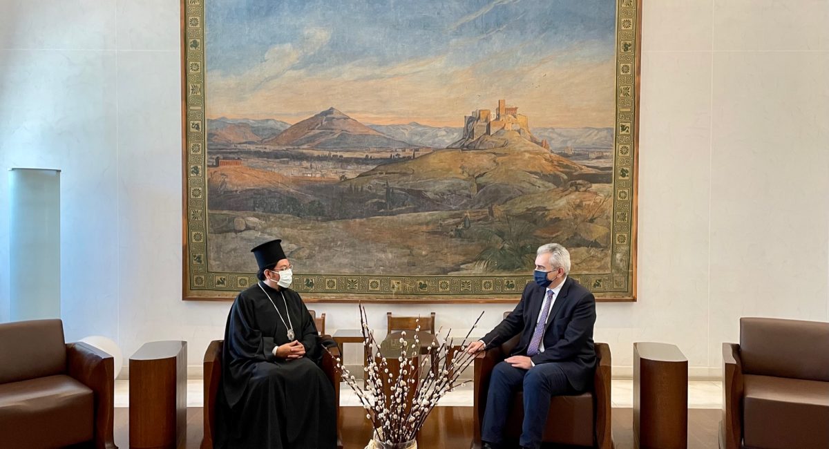 Luego de la correspondiente invitación, nuestro jerarca visitó la sede del parlamento de los helenos en Atenas. Fue recibido en la oficina del presidente del mismo por el Diputado Don Máximos Charakopoulos, presidente de la representación parlamentaria permanente en la asamblea inter-parlamentaria ortodoxa.